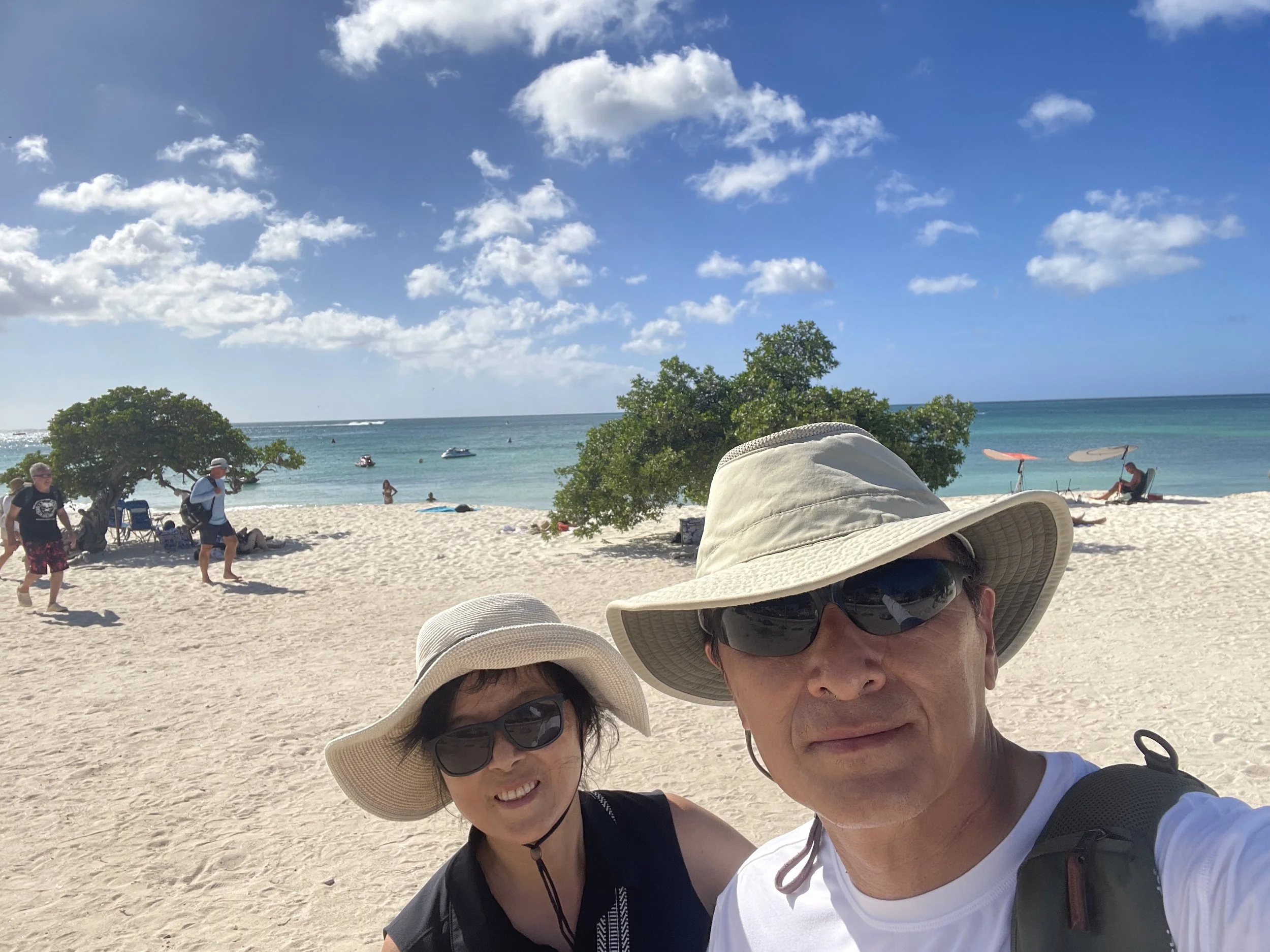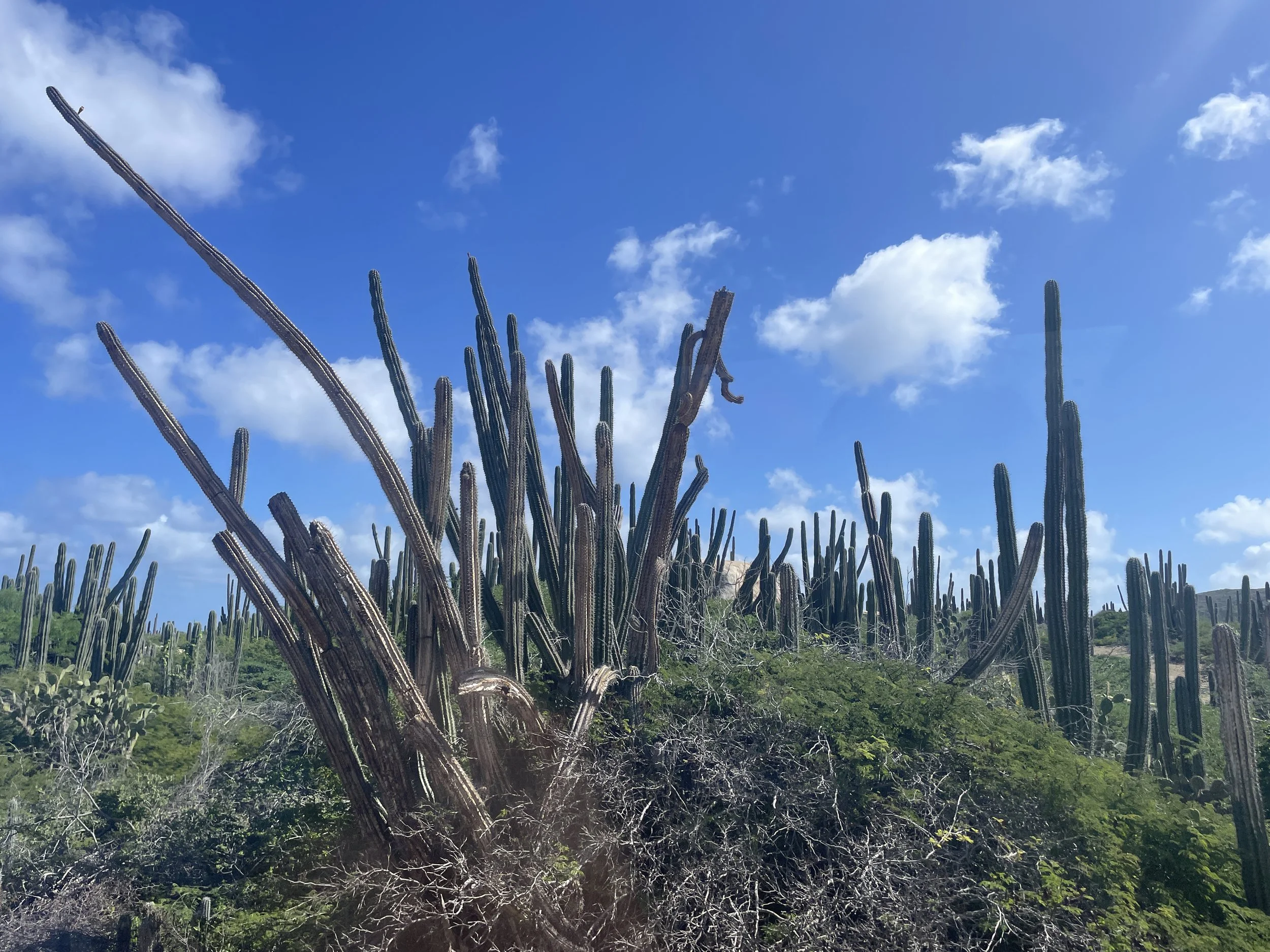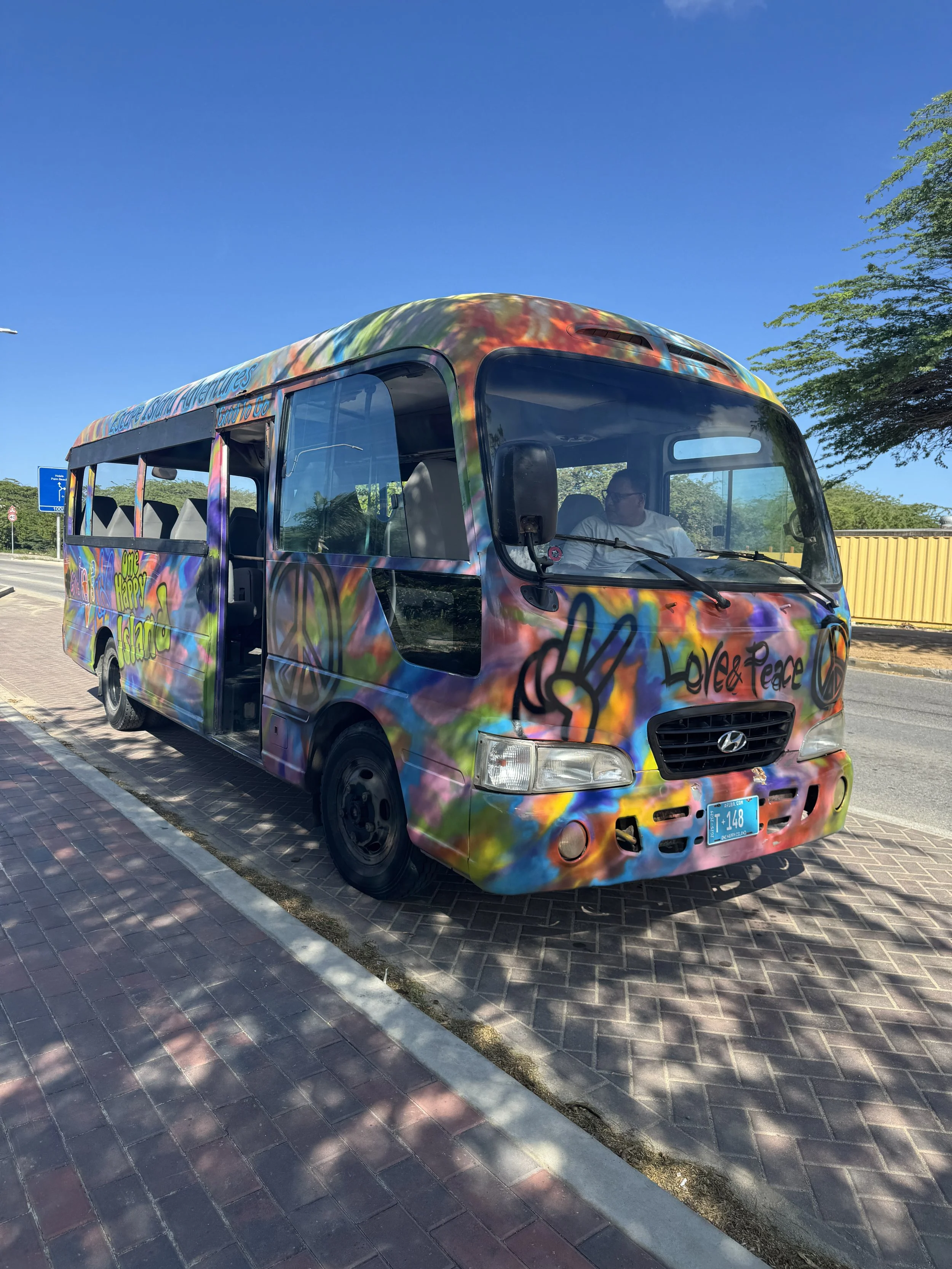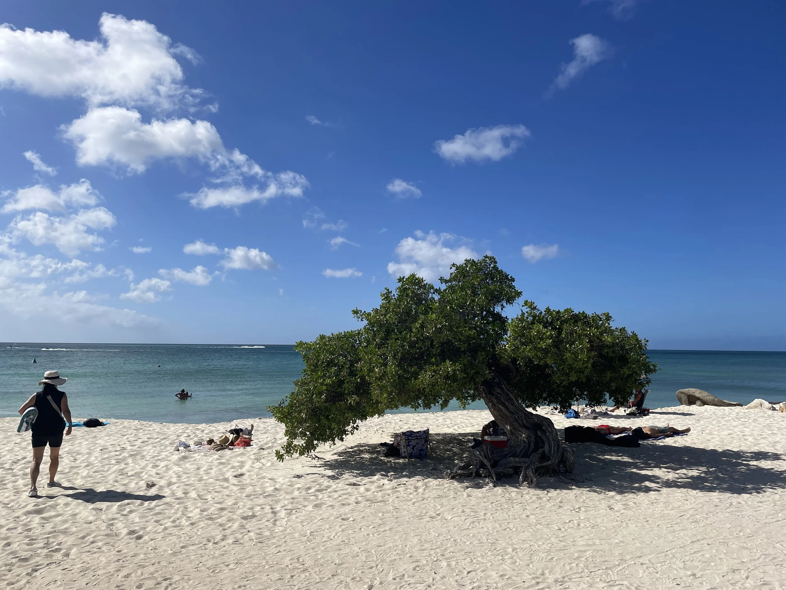 After lunch back on the ship, we headed out again and hired a taxi to visit the popular Eagle Beach to see the iconic divi divi trees. However, the driver dropped us off at a section of the beach where no trees were in sight. We were told we would need to walk about ten minutes to reach them. Halfway there, we noticed a party bus parked nearby. The driver offered to take us directly to the divi divi trees for a photo stop and then drive us back to the ship. Once we arrived, we wanted to spend a bit more time on the beach, and he kindly agreed to pick us up in thirty minutes. After a quick dip in the warm Caribbean Sea and some time admiring the wind-shaped trees, we were ready to return. The scorching sun was not exactly our favorite.