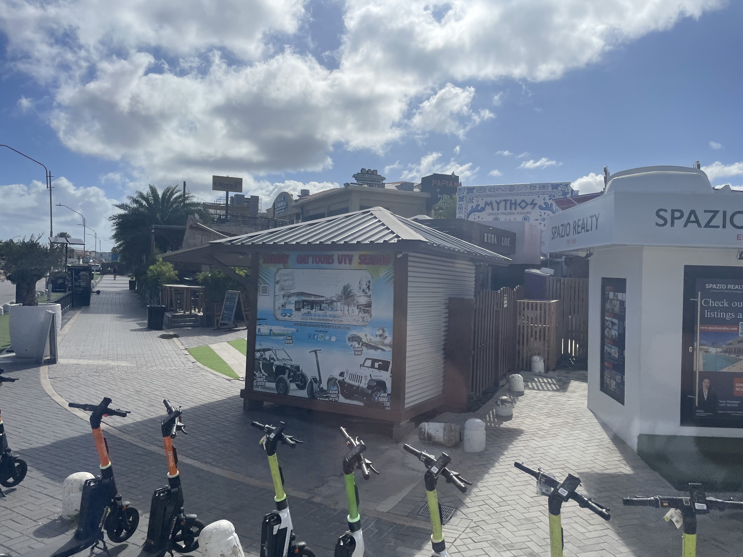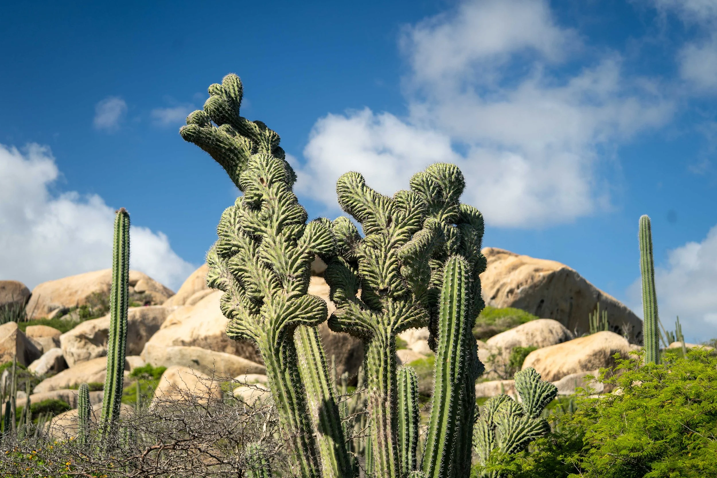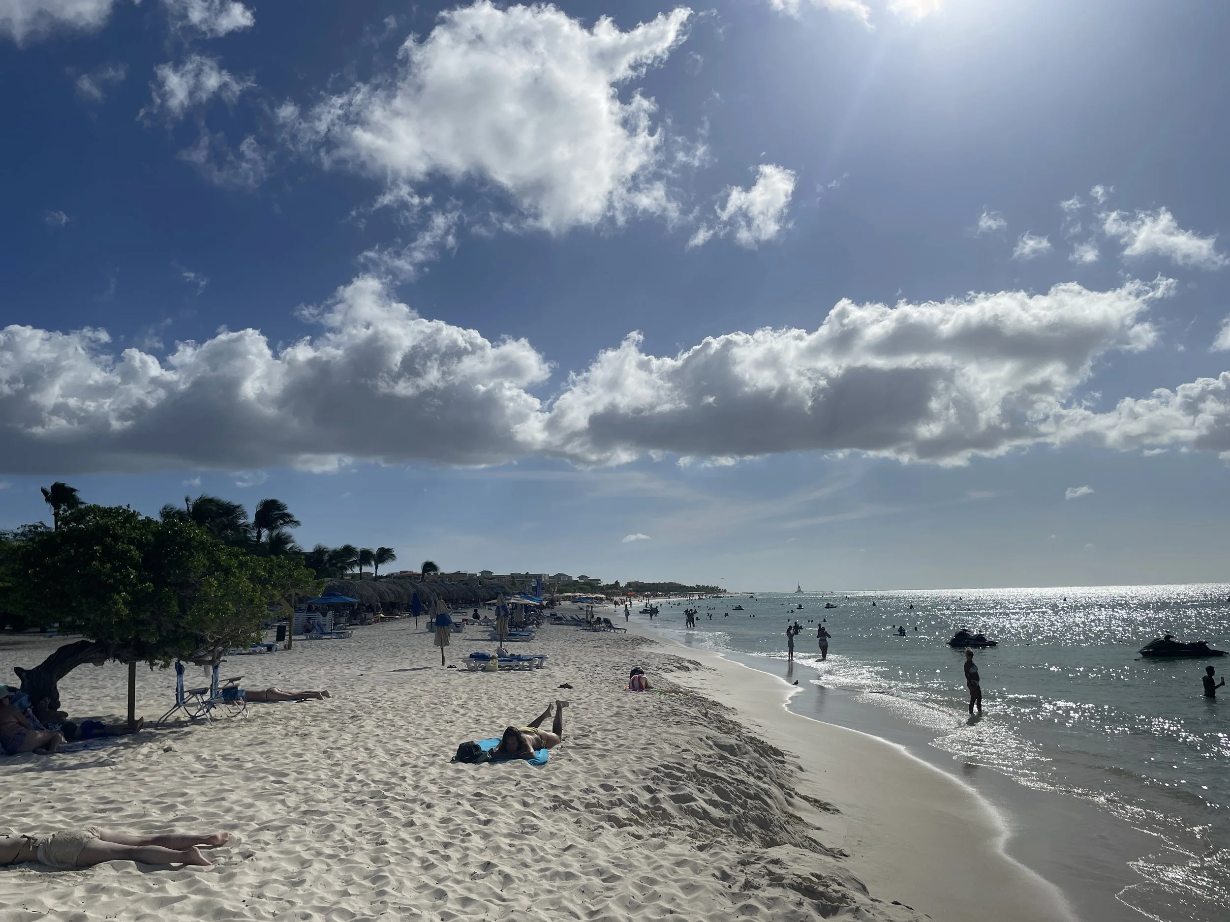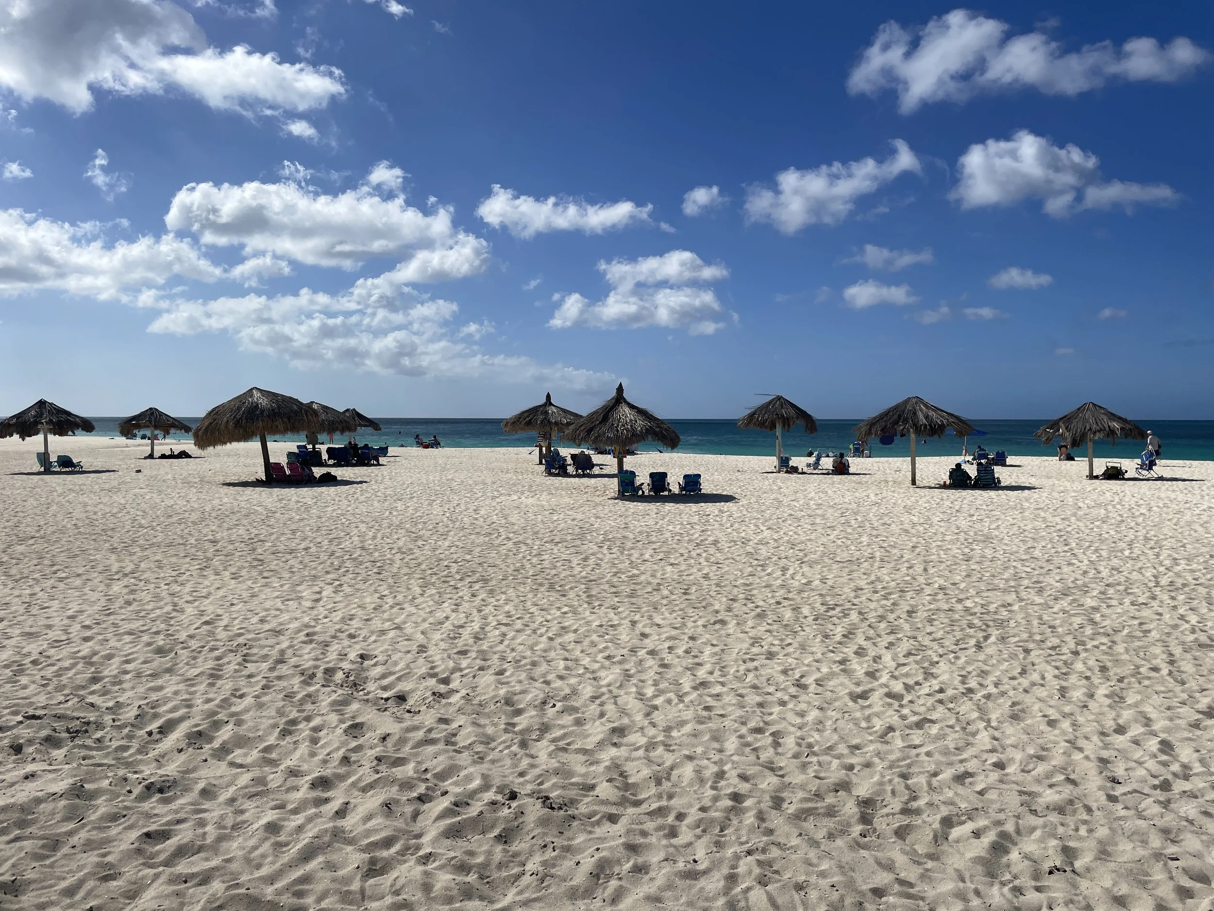 After lunch back on the ship, we headed out again and hired a taxi to visit the popular Eagle Beach to see the iconic divi divi trees. However, the driver dropped us off at a section of the beach where no trees were in sight. We were told we would need to walk about ten minutes to reach them. Halfway there, we noticed a party bus parked nearby. The driver offered to take us directly to the divi divi trees for a photo stop and then drive us back to the ship. Once we arrived, we wanted to spend a bit more time on the beach, and he kindly agreed to pick us up in thirty minutes. After a quick dip in the warm Caribbean Sea and some time admiring the wind-shaped trees, we were ready to return. The scorching sun was not exactly our favorite.