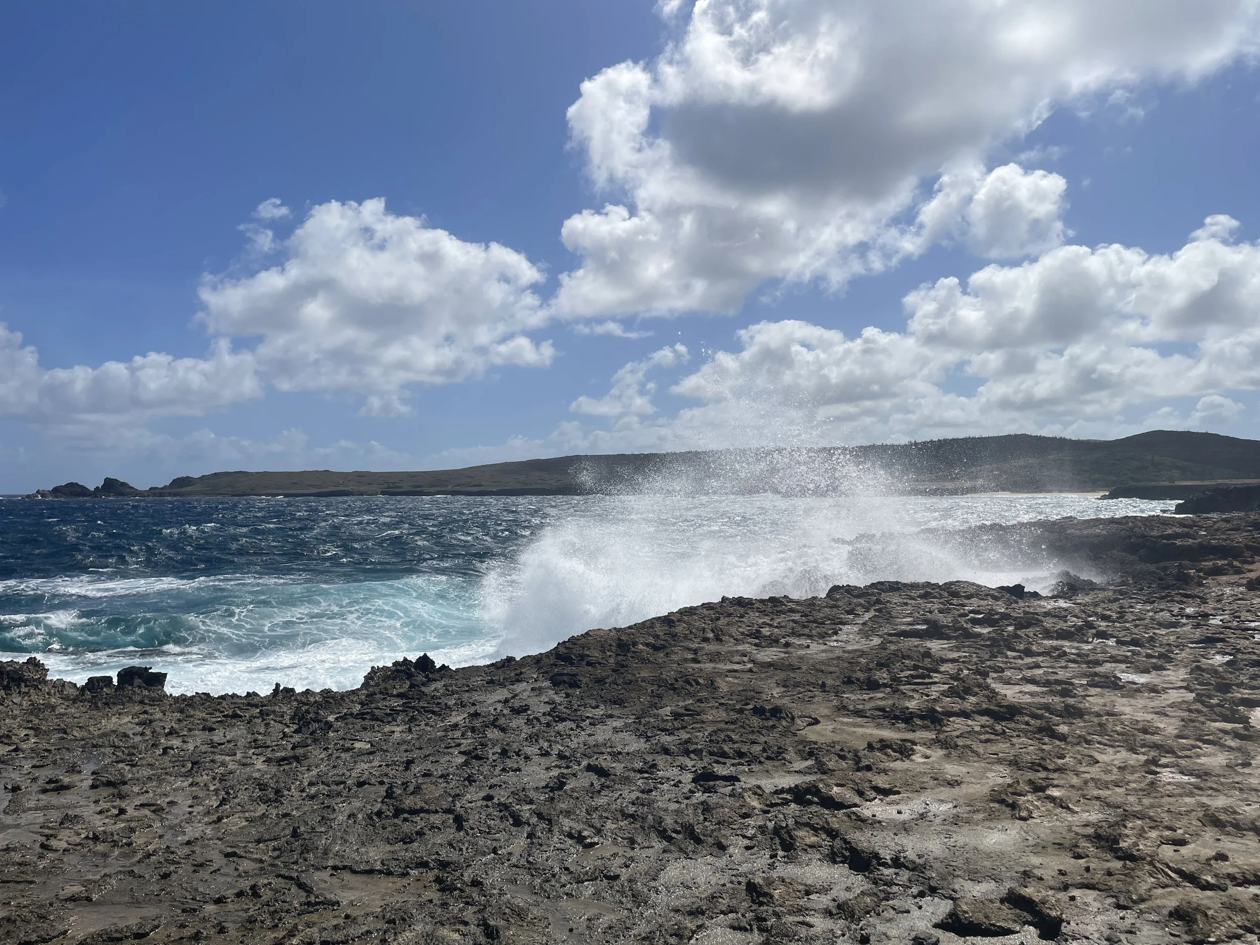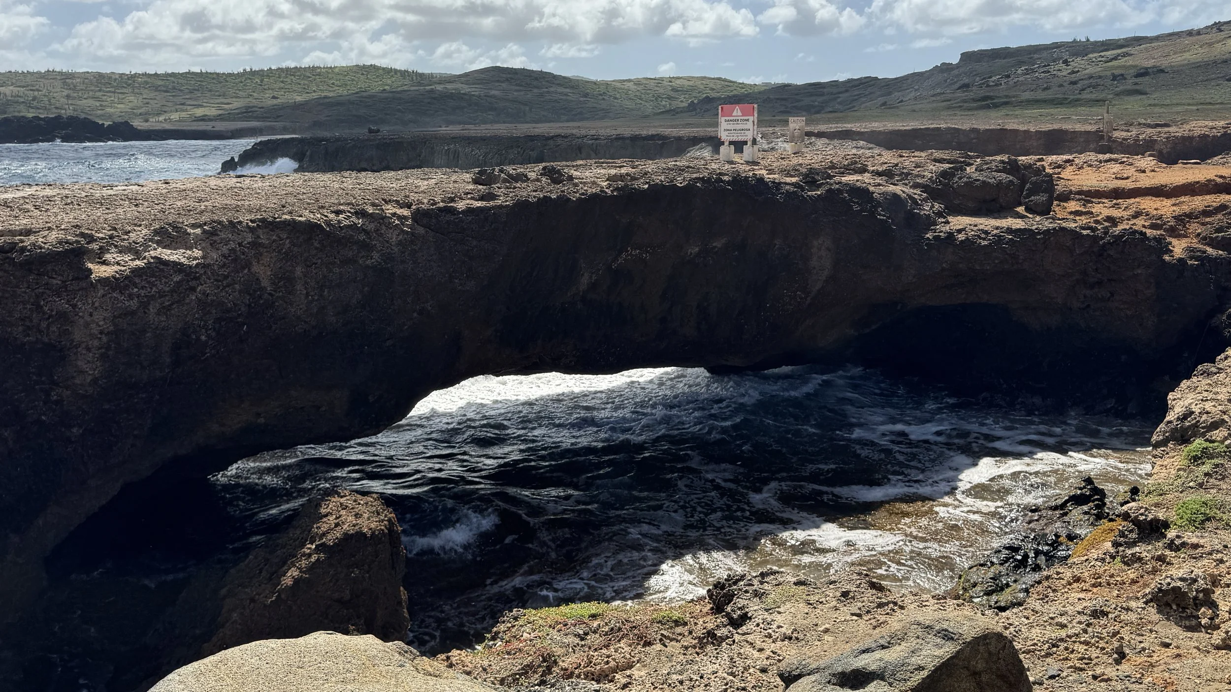 上午参加了一项船上组织的岸上游,首先参观了蝴蝶园,工作人员给大家科普了一下园区中的蝴蝶,各种各样漂亮的蝴蝶在园区中飞舞,有时还会停留在游客的头上,肩上。随后我们前往欣赏由远古火山活动塑造的壮观岩层。在小公园里走了一圈,偶尔手脚并用地爬一爬。我们还在一处天然桥遗址停留——那座著名的大型石拱桥多年前已经坍塌,但旁边较小的“宝宝桥”仍然保存完好。崎岖而壮丽的海岸线依旧令人震撼。导游一再强调,阿鲁巴岛这一侧的海岸线因地势的原因,浪很大,虽漂亮但绝对不是玩水的地方,否则有去无回。像往常一样,走进郊外、亲近自然,总让人感到格外清新与舒畅。