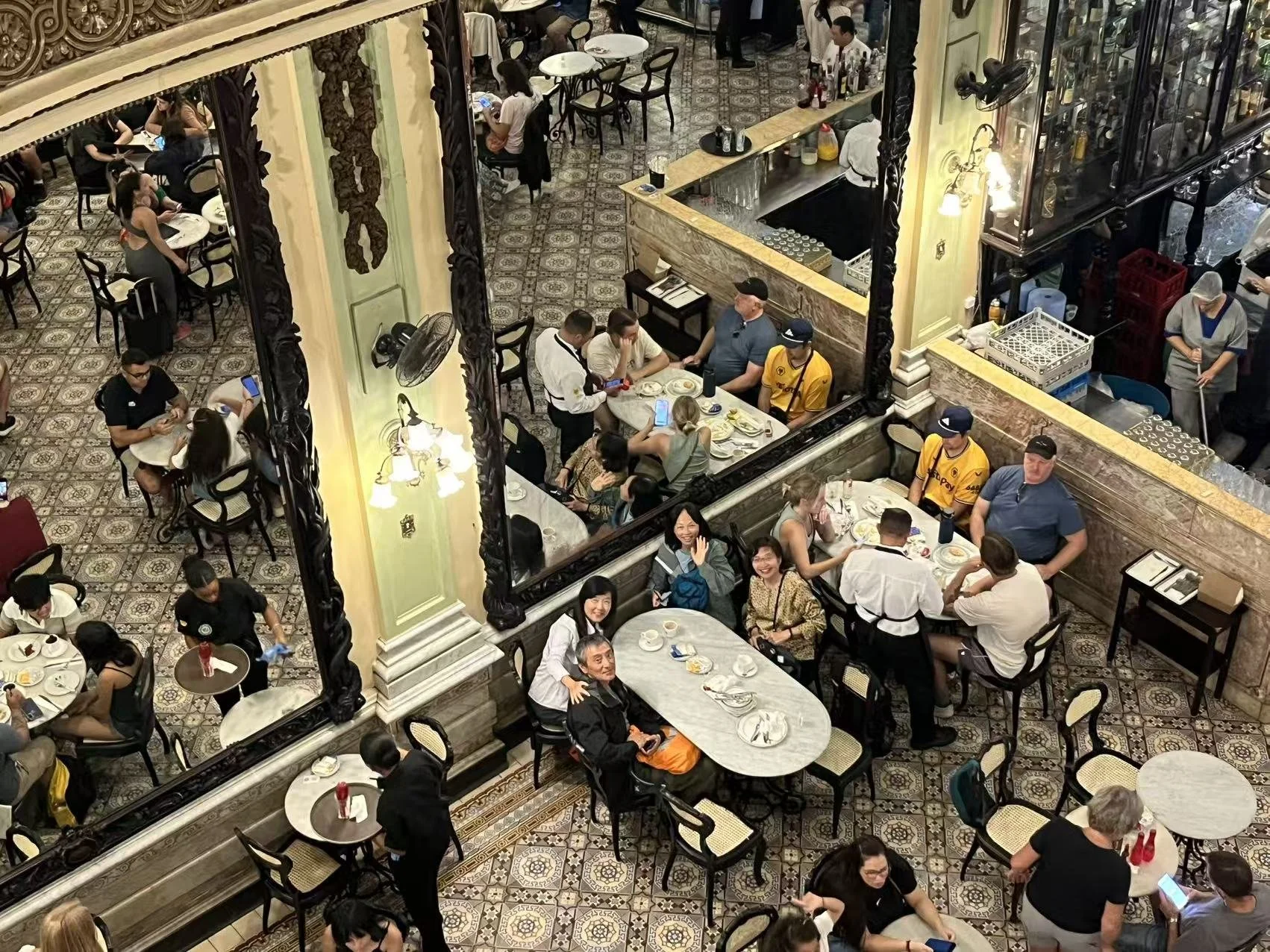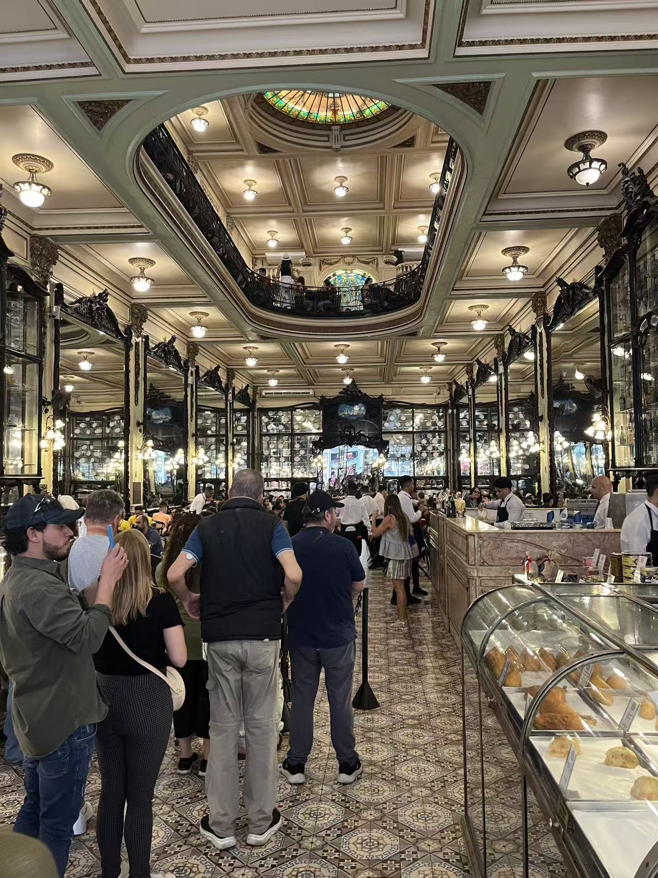 在山顶待了近一小时后,我们乘面包车下山回到地铁站,再搭地铁前往市中心,在科伦布咖啡馆(Café Colombo) 用午餐。两天前我们路过时,这里排着长长的队等开门。今天我们运气好,竟能直接入座,并且正好还是六个人的大桌。作为里约最古老的咖啡馆,它以宏伟的建筑和华丽的内部装饰闻名,令人印象深刻。餐点和饮品也颇为可口,而热闹的气氛更因多场生日聚会而显得格外喜庆。