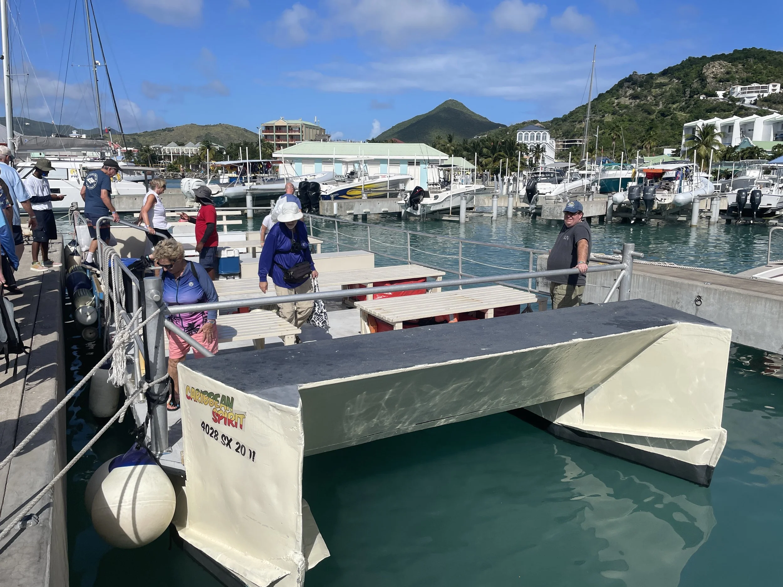 The ship anchored in Marigot, St. Martin, a French overseas territory. St. Martin is unique in that the island is divided between French and Dutch jurisdictions. The French side is much smaller, quieter, and far less touristy than the Dutch side.