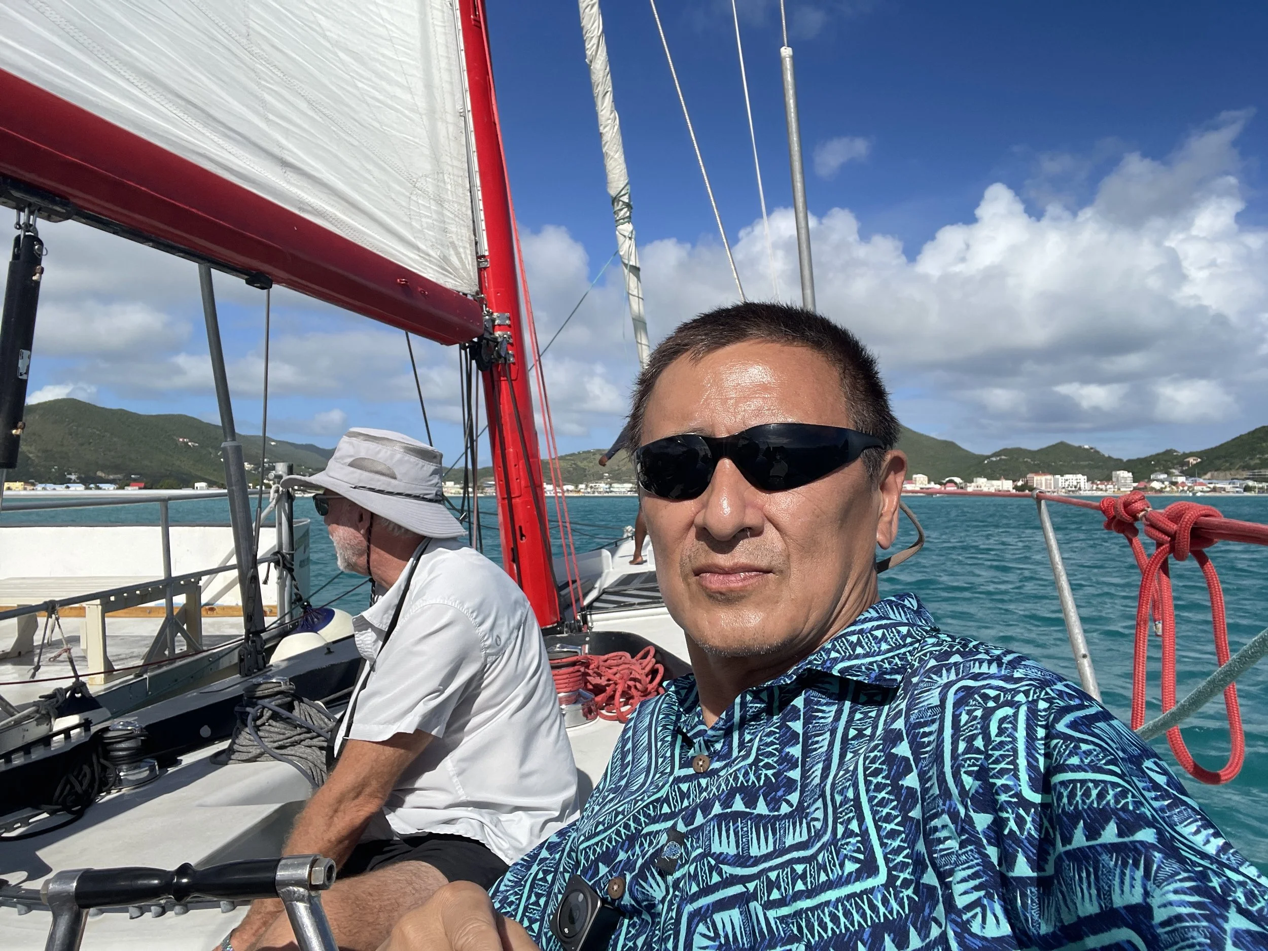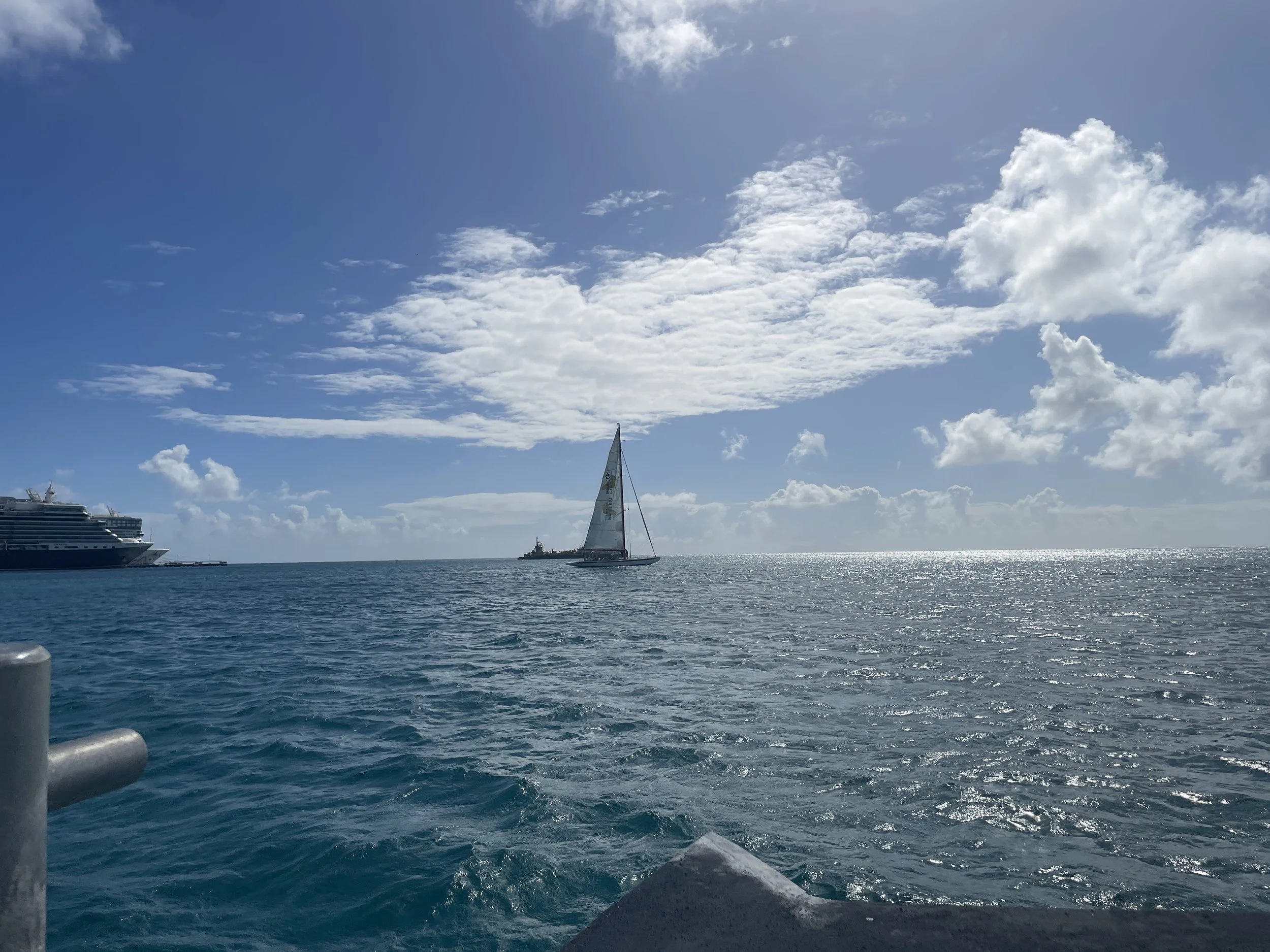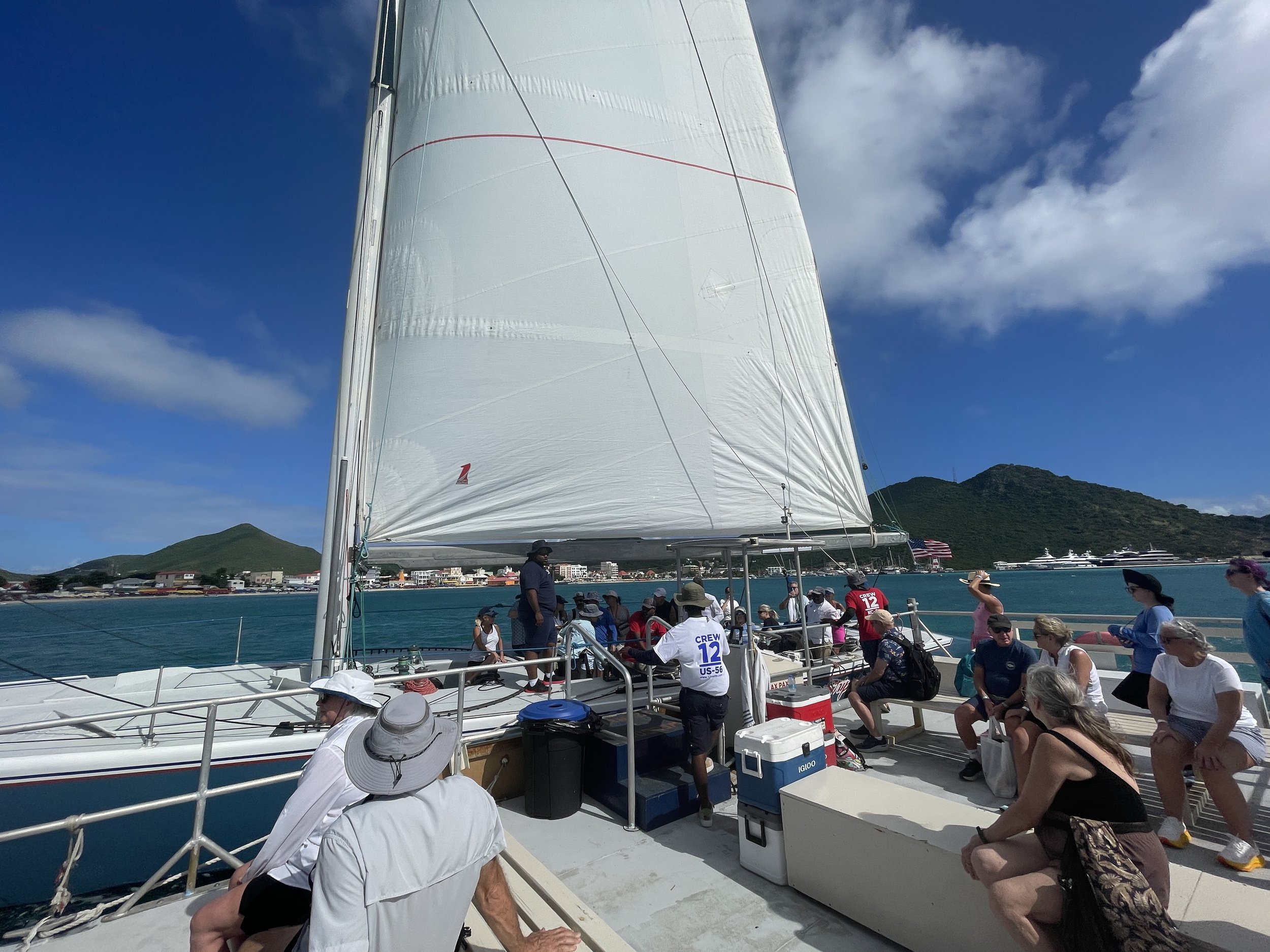 下午,Connie留在船上,Chenggang一个人加入船上组织的活动, 前往荷属一侧的菲利普斯堡(Philipsburg),参加著名的“美洲杯”12 米级帆船竞速体验项目。然而,从法属区前往荷属区的路况出乎意料地拥堵,全程几乎是车挨着车、寸步难行。原本只需 20 分钟 的车程,花了将近 一个小时。两边的反差非常明显:荷属一侧明显更加繁华、热闹,也更受邮轮游客欢迎。当天菲利普斯堡港口停靠了 4 艘邮轮,而法属一侧全年通常也就只有 8 到 10 艘邮轮靠港。