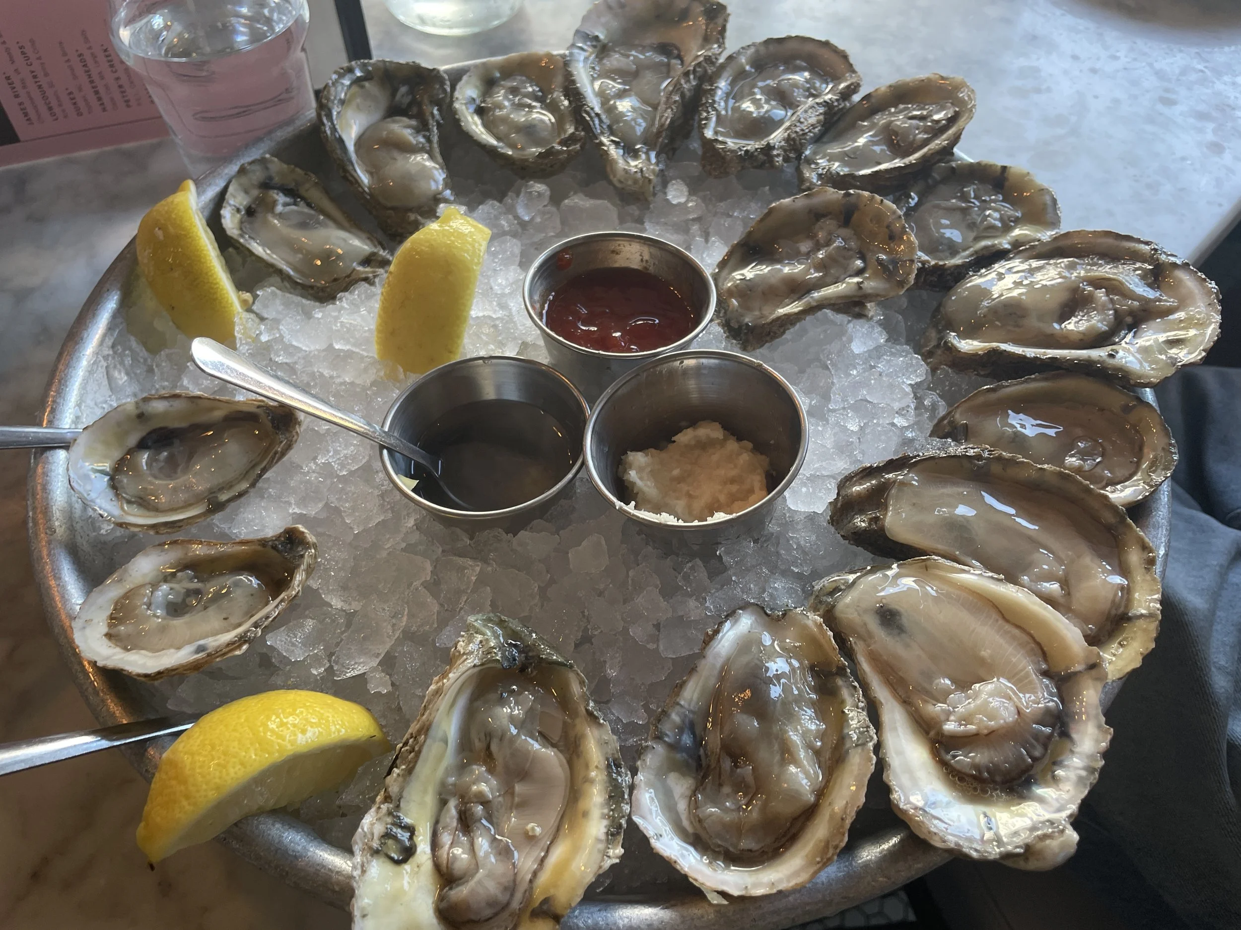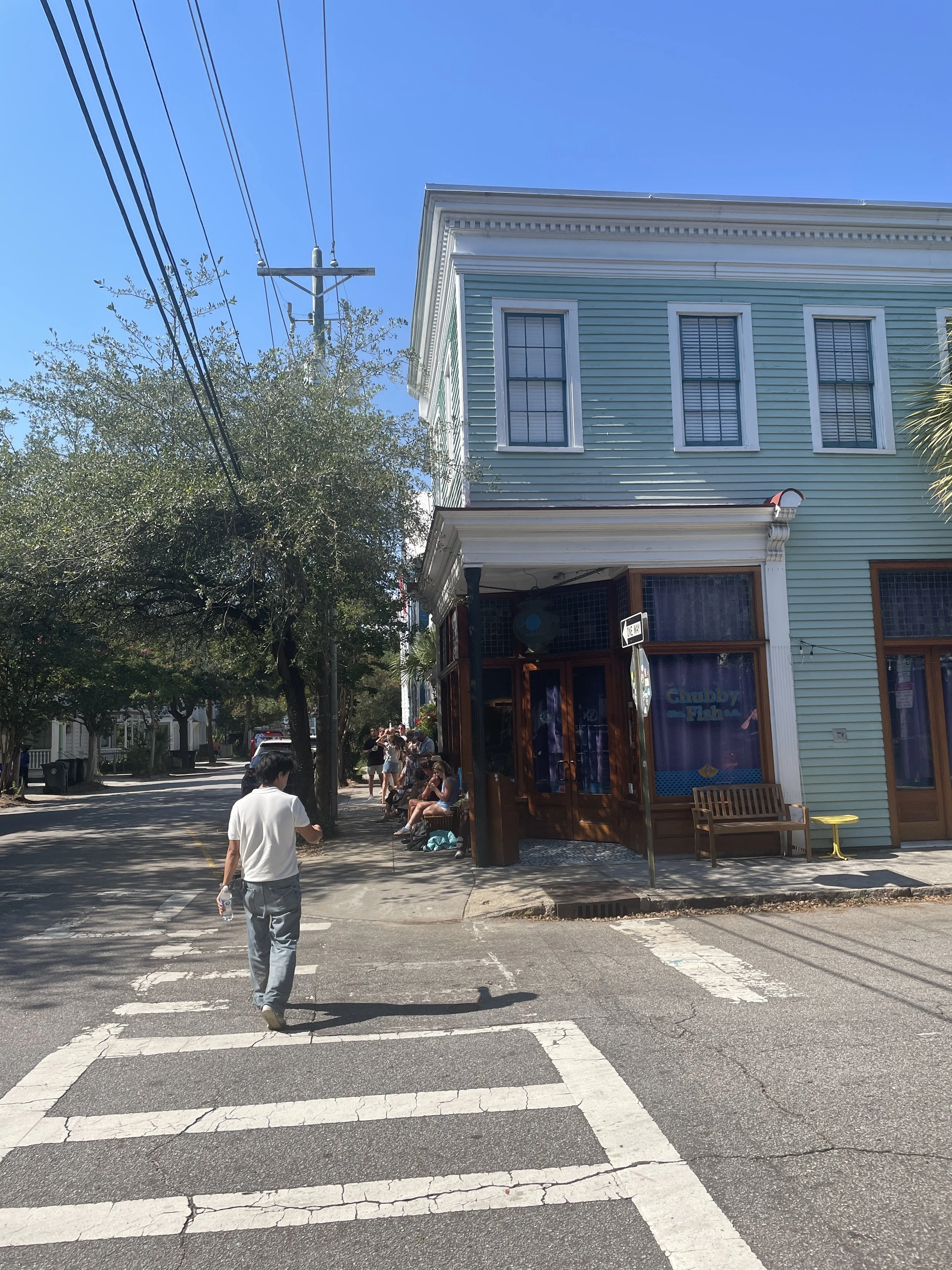 For Cody’s birthday dinner, we had our eyes on one of the most popular seafood restaurants in Charleston—Chubby Fish. The restaurant opens at 5 p.m., takes no reservations, but allows you to put your name down for later seatings. We arrived at 4 p.m. and joined the already-forming line. When the doors opened at 5, we were lucky enough to secure seats for the 6:45 p.m. second seating. With more than an hour to spare, we walked to The Darling Oyster Bar nearby and enjoyed 16 oysters—some costing only $1 each.
