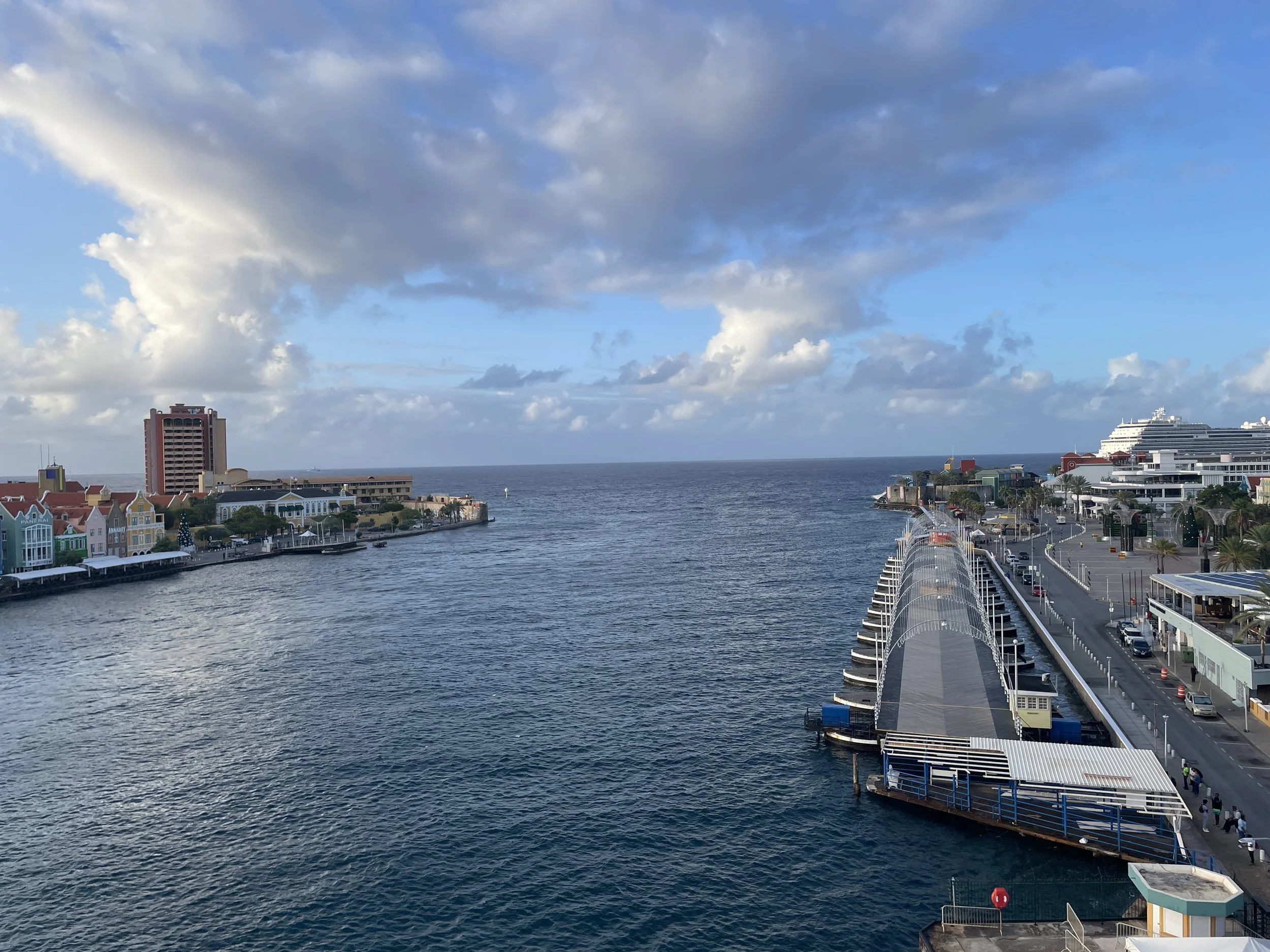 That night, the ship wasn’t scheduled to depart until 9:00 p.m., so we wanted to return to Punda to experience the nightlife. At the same time, we worried the bridge might open again and leave us stranded on the wrong side. After an early dinner, we set out with plenty of time—only to see the bridge begin to open again, posted as a 45-minute opening. We headed straight for the ferry.