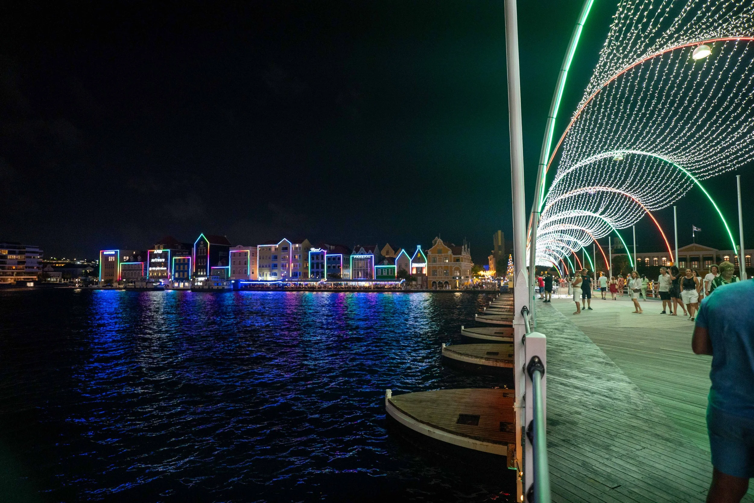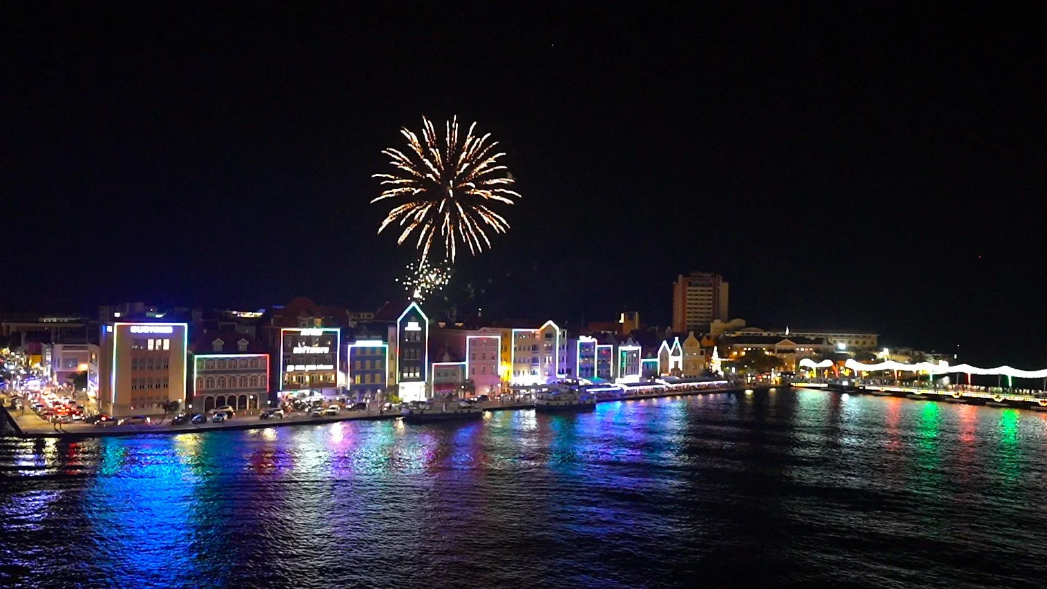 走过灯光璀璨的浮桥,我们再次欣赏库拉索迷人的夜景。而压轴的惊喜也随之到来:每周四晚上8点,这里都会燃放烟花。我们回到邮轮上,在船上看海湾两岸灯火辉映,烟花在夜空中绽放,整座城市美得令人惊叹。