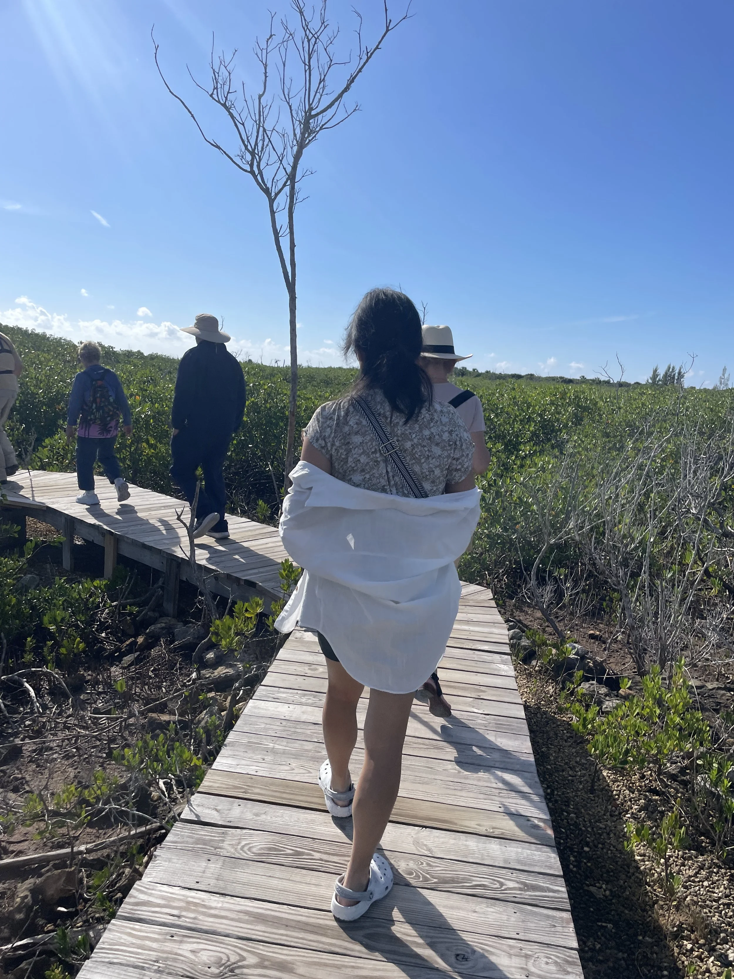 昨天是我们这二十多天行程的最后一个海上行,同时离美国也越来越近了。今天早上船来到了我们本次邮轮行程的最后一站,巴哈马群岛的弗里波特。我们参加了一个水下洞穴之旅,途中驱车穿越岛屿。一路上,仍能清楚看到2019年飓风留下的痕迹:废弃的房屋,在一些地方,道路一侧的木麻黄(澳洲松)因海水倒灌而枯死,而不远处的同类树木却顽强存活,形成了强烈的对比。