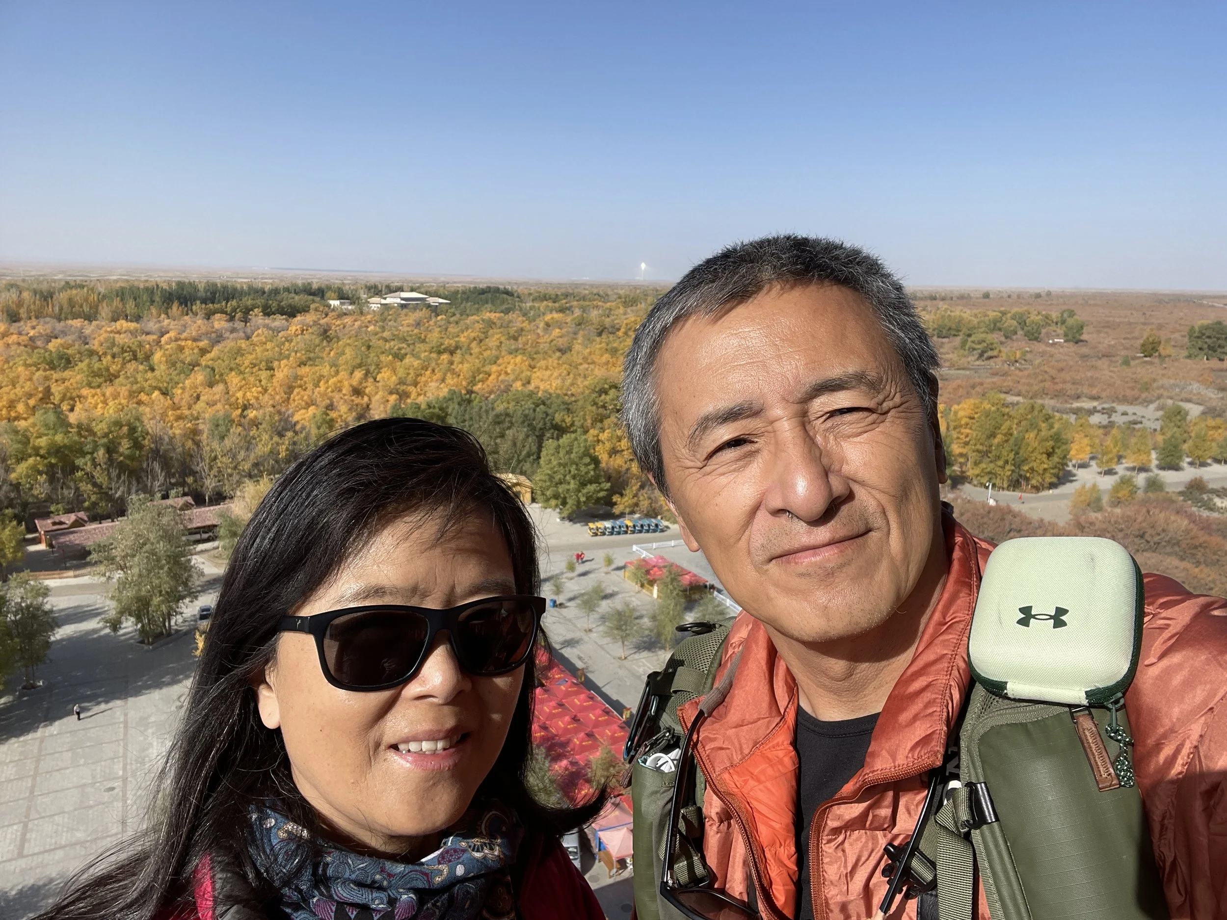 Next, we took another shuttle to the observation tower and paid ¥20 to ride the elevator to the top. From there, a sweeping panorama of the golden forest unfolded beneath us, with a distant view of a solar-power tower shimmering in the desert.