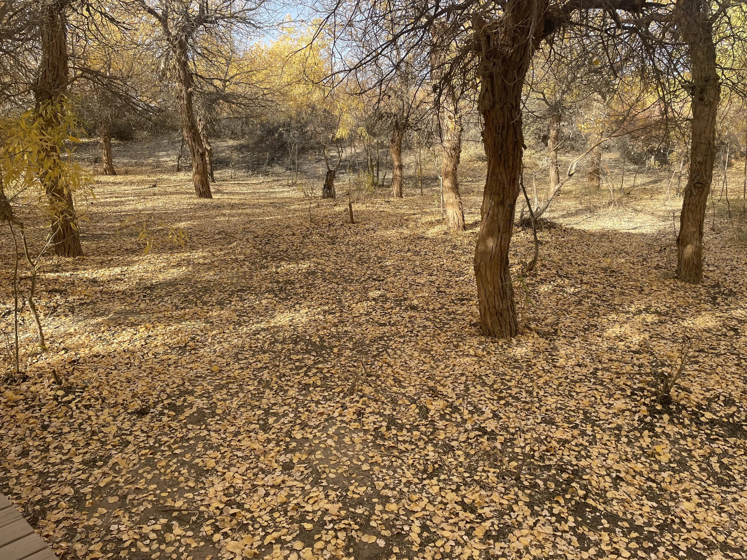 After being dropped off at the entrance, we boarded the park shuttle and got off at the third stop—the main Euphratica Forest area. As sunlight streamed through layers of golden leaves, we followed a winding boardwalk deep into the grove. The Populus euphratica trees stood tall and proud, their gnarled trunks and radiant canopies forming a dazzling contrast against the endless blue sky. We admired the various distinct shapes of their leaves, each glimmering in the warm afternoon light.