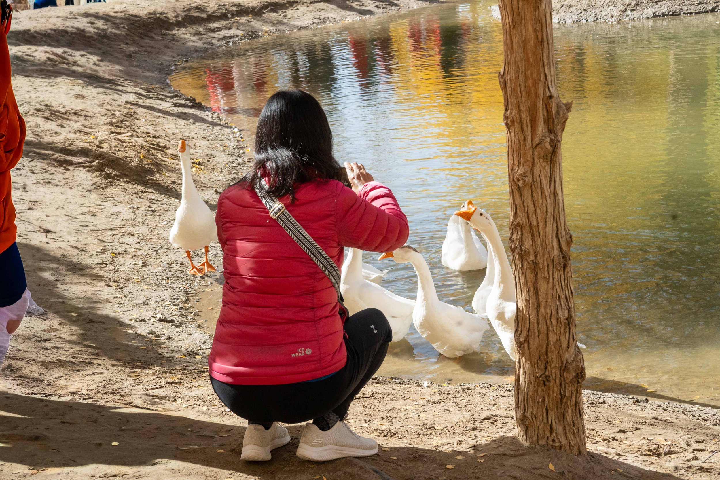 Finally, we arrived at the main lake. The still water mirrored the golden trees so perfectly that the entire scene felt dreamlike and ethereal. While many visitors gathered by the lakeshore for photos, we wandered farther into the quieter parts of the forest and launched our DJI drone to capture aerial footage of ourselves walking beneath the glowing canopy. The golden hues, tranquil reflections, and vast desert backdrop created a truly magical and unforgettable experience.