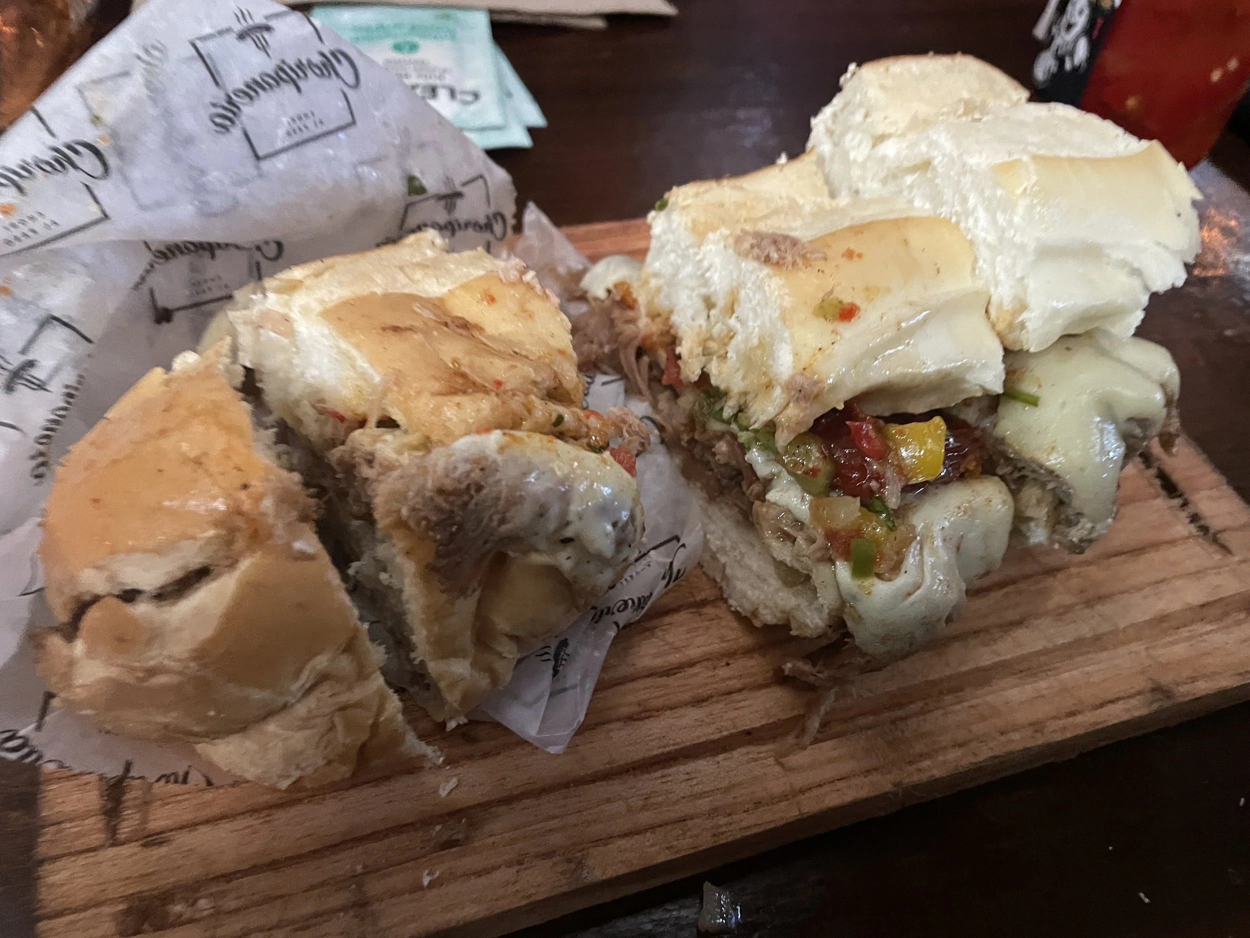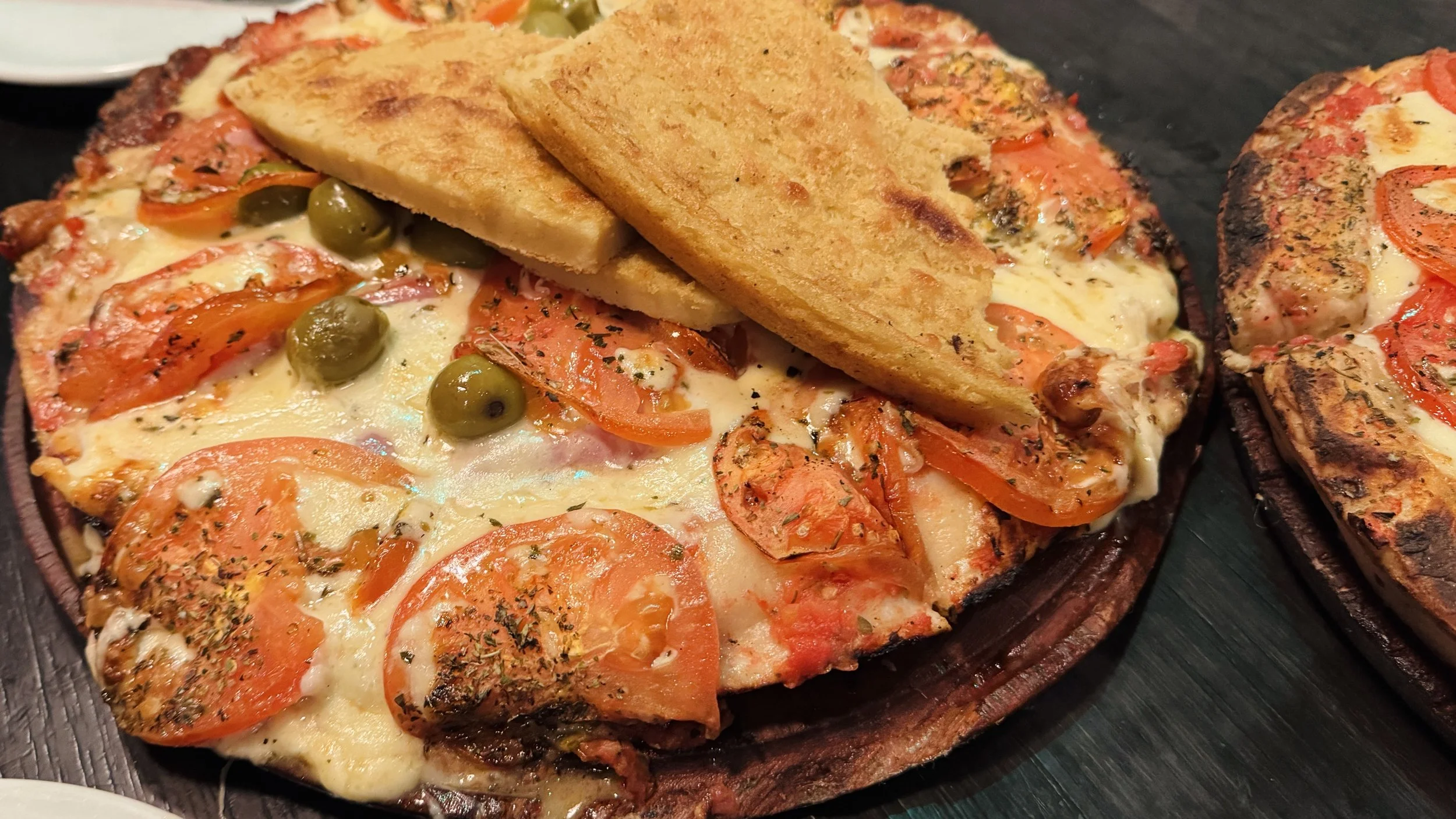 一天的行程在热闹的剧院区画下句点。我们来到布宜诺斯艾利斯最著名的披萨店 Pizzería Güerrín 用餐。厚重多芝士的披萨相当油腻,即便搭配上当地经典的 鹰嘴豆饼 (fainá) 却不合我们的口味。没吃完的部分我们打包带走,并一致决定这将是此行最后一次尝试披萨。
