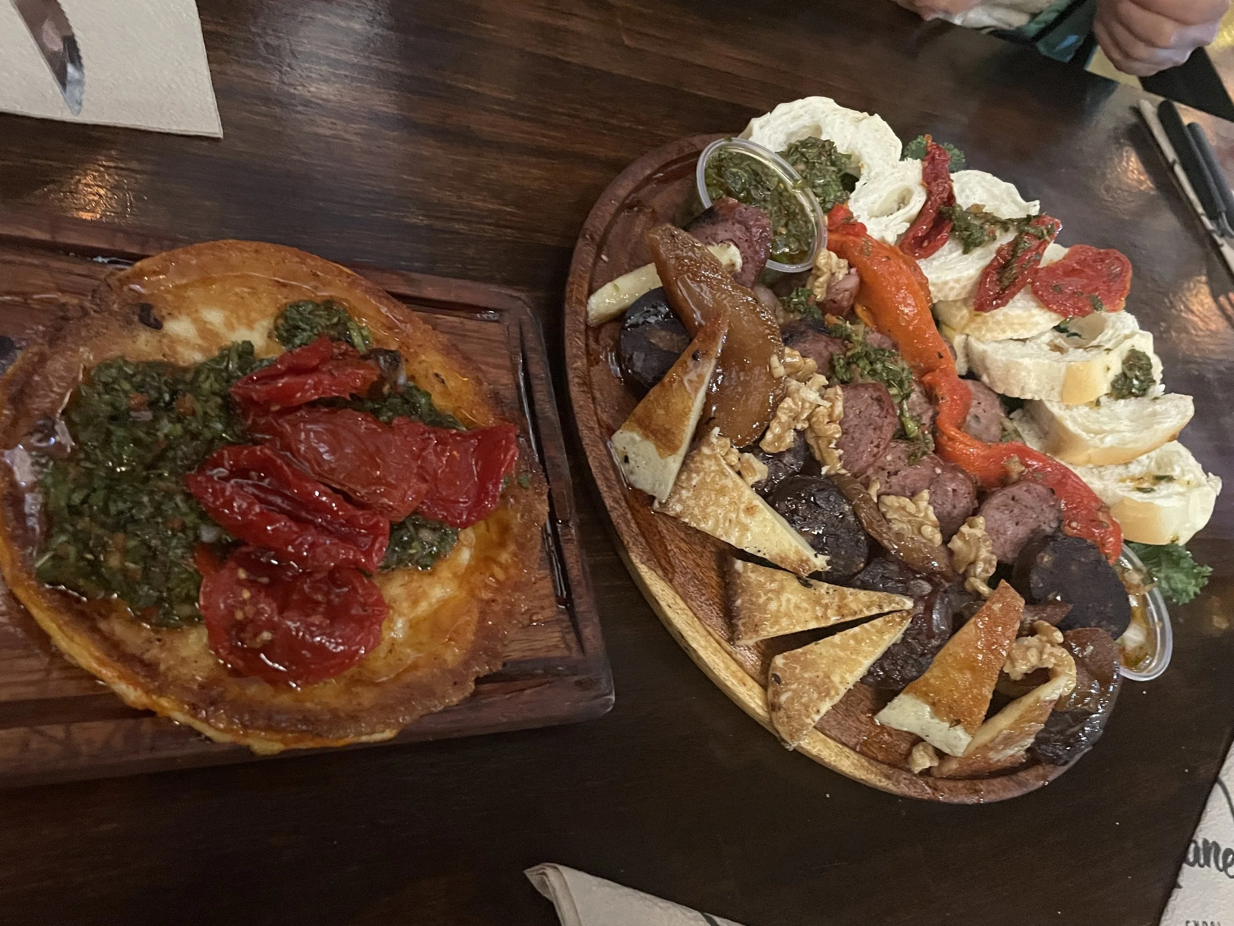 We also stepped into the San Telmo indoor market, which was much livelier than two days ago when we arrived too late. This time every café was packed, and finding seats for six was nearly impossible. Instead of sampling different stalls, we waited for a table at La Choripanería, a highly recommended spot inside the market, and shared a traditional Argentine platter that included black sausage.