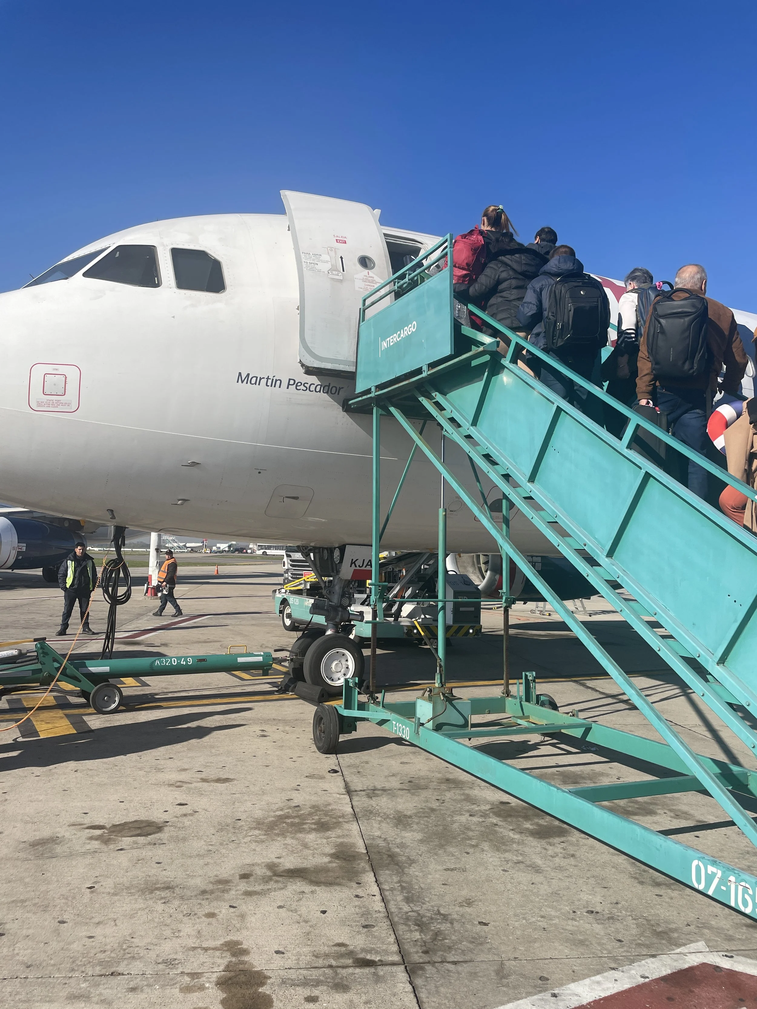 Just as we reached the train, an update came through: the Buenos Aires flight was delayed, first by 15 minutes, then by 40. Hope returned. By the time we reached the gate, we found many other passengers waiting; like us, several had been diverted to other cities before making it back. In hindsight, we realized a simple check — whether boarding had actually begun — could have saved some stress. In the end, the flight departed two hours late. Relieved, we finally boarded and set off for Argentina.