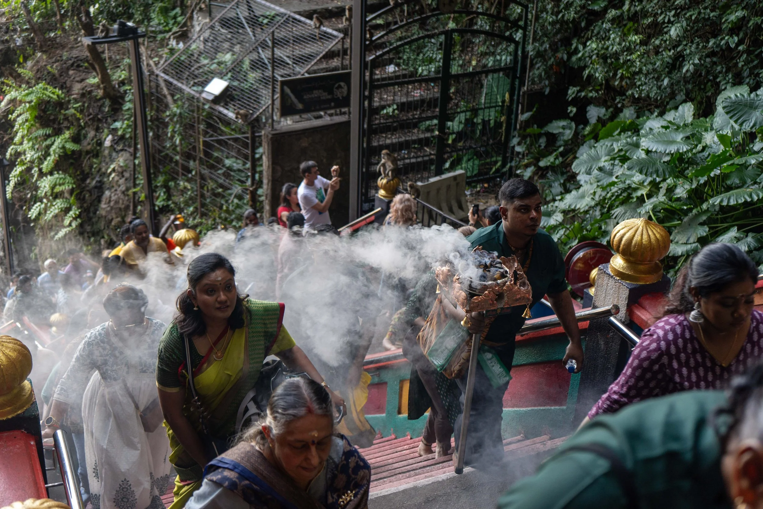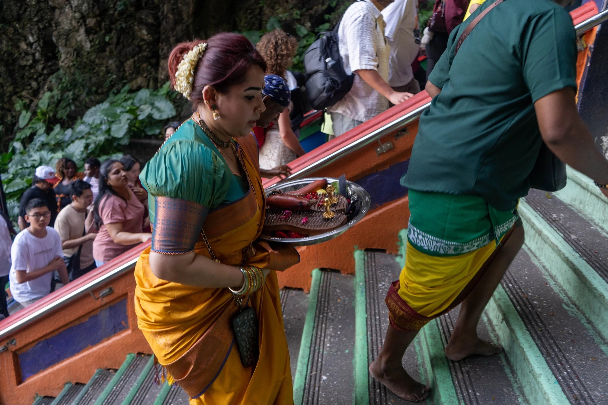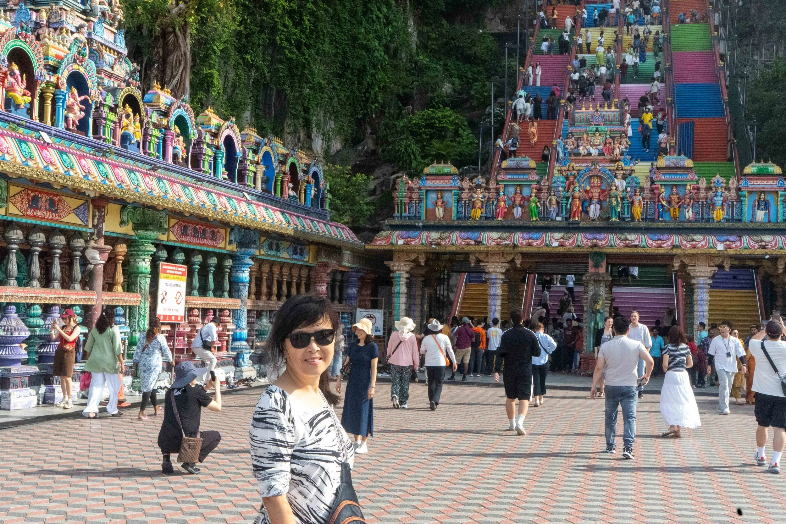 黑风洞是一座著名的石灰岩洞穴群,内有多座印度教寺庙。主洞需沿着272级色彩鲜艳的阶梯攀登而上,气势颇为壮观。也许因为是周末,现场有一些宗教活动,看到信徒背负“卡瓦迪”(Kavadi)还愿。我们还参观了讲述《罗摩衍那》故事的洞穴。猴子也是这里的一部分,在阶梯间穿梭跳跃,不少游客给它们投喂食物。整个参观过程既生动又富有文化气息。