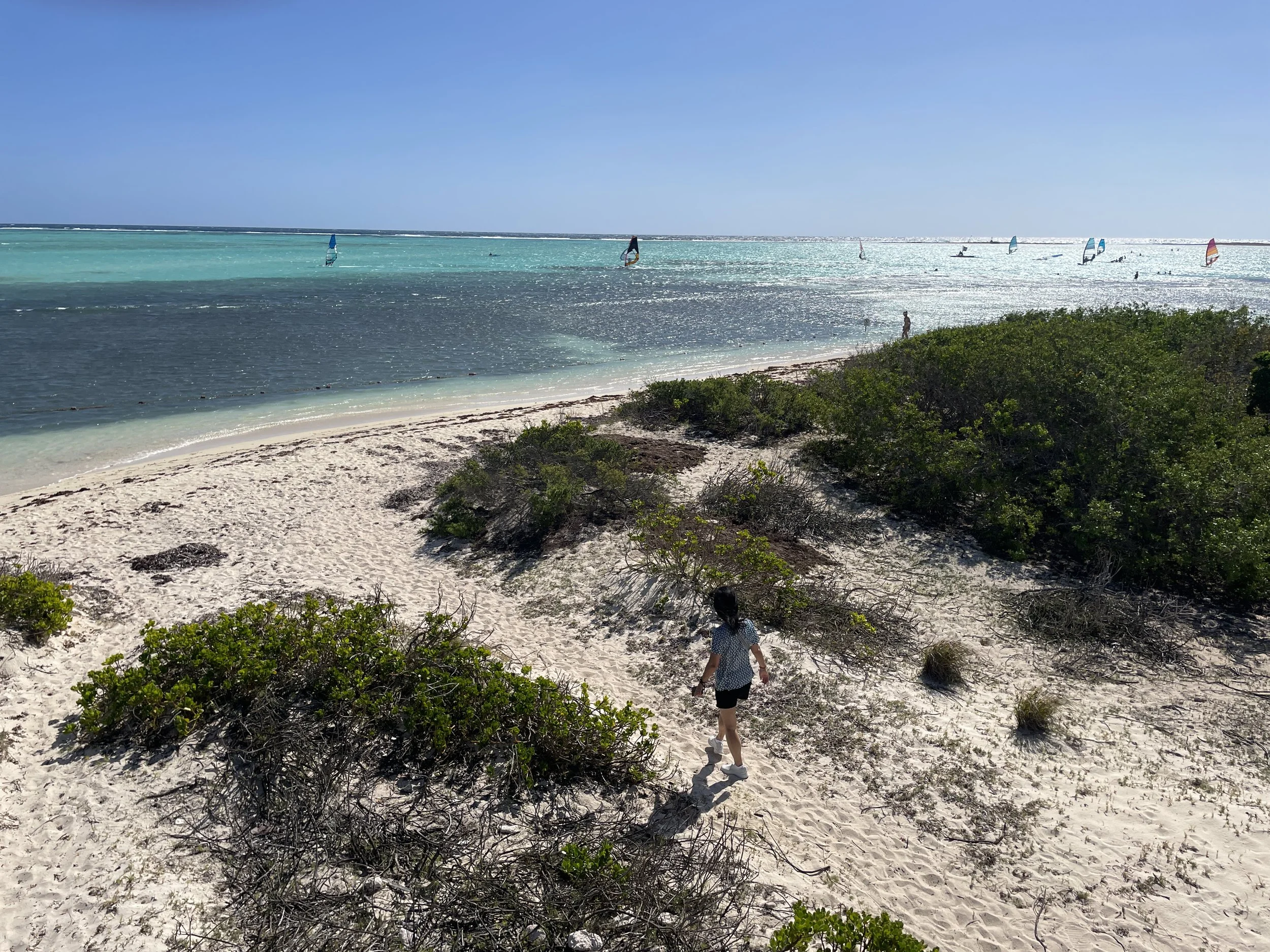 回船享用午餐后,我们再次外出,叫了出租车前往著名的鹰滩(Eagle Beach),想要一睹阿鲁巴标志性的迪维迪维树(divi divi trees)。然而我们下车点是一段看不到树的海滩上,问了别人,告诉我们树在海滩的尽头,需要步行大约十分钟才能到达。走到一半时,我们注意到路边停着一辆派对巴士。巴士司机主动提出可以直接载我们前往迪维迪维树所在的位置拍照,并随后送我们回船。到达后,我们希望能在海滩多停留一会儿,他也爽快地答应三十分钟后来接我们。先是在网红打卡的地方拍照留念,欣赏被海风塑造成独特姿态的树木,又在暖洋洋的加勒比海里玩了一会儿。巴士司机准时来接我们回船。炙热的阳光并不是我们最享受的部分。