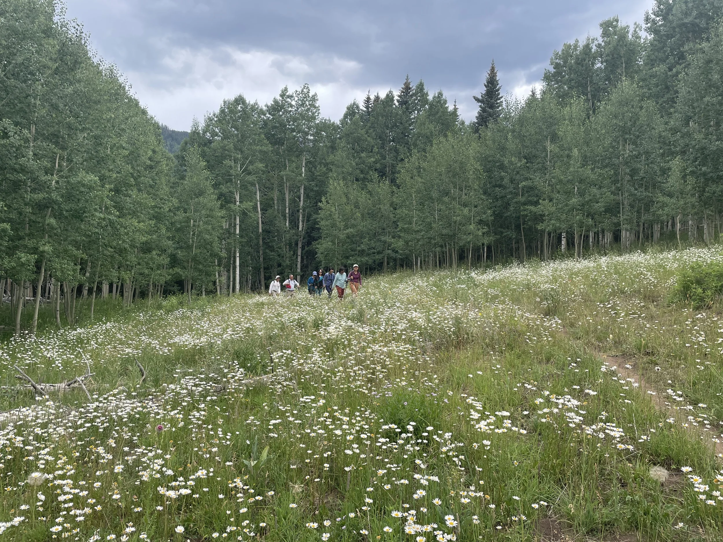 On July 18, we set out for the Ice Lake Trail, considered one of the best hikes in the San Juan National Forest near Silverton. Due to its popularity, the parking lot was already full when we arrived in the morning, so we parked along the roadside. Park rangers briefed us on weather safety before we began. The sky was overcast, and it soon began to rain. Despite the weather, we enjoyed the hike as we ascended the trail. About halfway up, just as we emerged from the forest, a loud clap of thunder echoed overhead. Since the rest of the trail was above the tree line, we made the cautious decision to turn back. Although some of us were hesitant to give up, safety came first. We covered about 3.5 miles in total.